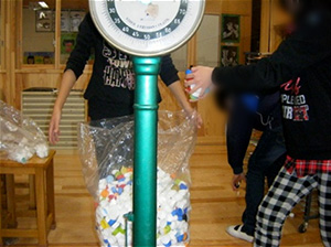ペットボトルのキャップを集めた袋15袋分を前にして,