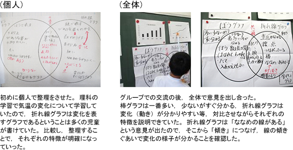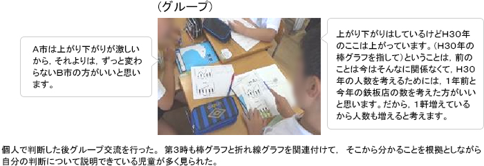 〇お互いの考えを説明する中で,何となく思っていたことがより明確になったり,相手の考えを聞いてグラフの見方が広がったりする児童が多く見られた。また,相手を納得させるという視点を与えたことで,相手意識をもって筋道の通った説明をしようとする姿が見られた。
