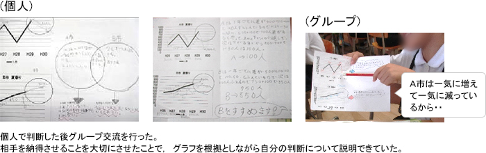 ③資料を問題解決のために活用する力にまで高めるために,資料の読み取りに終始することなく,自分ならどう考えるかという意思決定をさせる場の設定を行う。