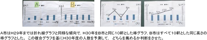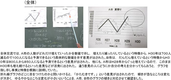 第2時は,「もし自分が,庄原焼きで地域の活性化を図られている○○さんに出店を薦めるならどちらの夏祭りですか。」という問いかけから授業をスタートした。自分達の住む市からの距離や夏祭りの内容は同じであると考えることを確認し,H26年からH29年までのA市とB市の夏祭りの人数の推移を折れ線グラフに表したものを示した。