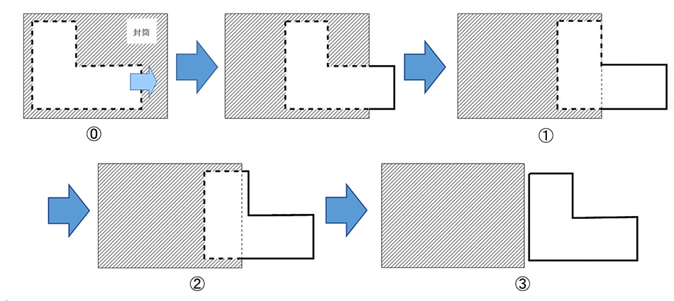 本実践の「長方形を組み合わせた図形(L字型)の求積」で『働かせたい「数学的な見方・考え方」』は,「求積することができる既習図形(長方形)に着目して考える」である。それに児童が着目できるようにするための『仕かけ』として,下図のように,求積したいL字型の図形を封筒で隠し,動画のようにL字型の図形を徐々に見えるように提示していった。