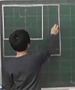 C151:えっと。ここ(横の分の差をさして),ここのあれが,1,2,3センチで。こっちも(縦の分の差をさして)1,2,3センチで。だから,うんと,縦と横,全部3センチ足せば,ここが,1,2,3でここに(元の長方形を右に3マス分伸ばしてかく)なって。