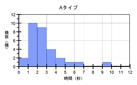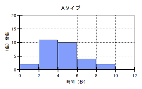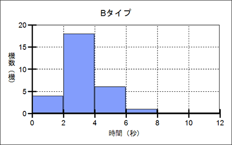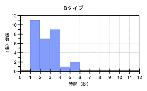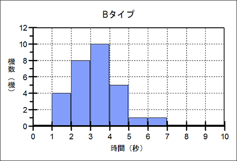 グラフの作成と分析の結果を全体で共有した。黒板には,階級2秒のグラフ(図1および図2)を提示した。まずAタイプとBタイプのどちらがよく飛んでいると判断したのかを尋ねると,子供の意見はAタイプに集中した。子供から出た根拠は以下の通りである。