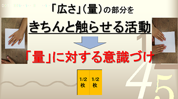 等分した後のそれぞれの広さを「基の広さの1/2」だと認識できるように,「開いて元に戻しもう一度折ったり,掌でくまなく触って比べたり,さらに折り目を直線でなぞらせたりするなど実感を伴った理解」を目指しました。また,作った「1/2の広さ」と「1/2の広さ」を合わせてもとの量である「1の広さ(基の広さ)」になることも操作活動を通して確認し,もとの大きさ(広さ)と1/2の大きさ(広さ)を関係的に見ることができるようにさせること,そしてこのことを自分なりの言葉で説明できることをねらいました。