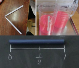 次に,分数を感覚的にとらえ直観的に判断する力を身に付けさせるために,広さだけでなく1年生で扱った「長さや水のかさ」での学習をスパイラルに設定しました。様々な量を1/2にしたり,1/2と1/2で,もとの大きさ(1)になるということを,操作活動を通して実感させたりすることで,ある意味帰納的に理解させようと考えたのです。これも,1年生で数を理解させるために「様々な具体物を扱うことで,数が量や順序(位置)を表わすことを感覚的にもとらえさせる。」ステップを踏襲したのです。