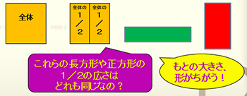 ここでは,「全体の1/2の長さ」と「1mの1/2の長さ」の見方や捉え方の違いを明らかにすることによって「分数を割合的に見る段階(分割分数)から,数として見る(量分数)段階」へと「分数の見方」を広げていけると考えました。