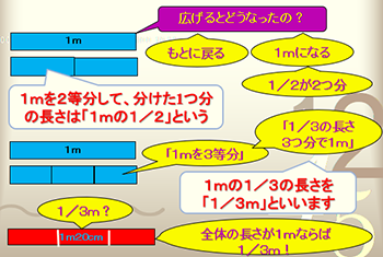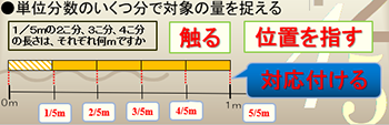 前時の学習を生かし,1/5mを単位分数として,そのいくつ分かで考えることができたので,1mよりも長い長さでも,子供たちは戸惑うことなく分数で表すことができました。