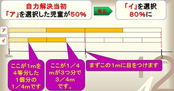 自力解決当初は,全体を等分割したアが「3/4m」であるとした児童が約半数いました。しかし,①②のステップを踏ませることにより,自分の考えを修正する児童が出てきました。