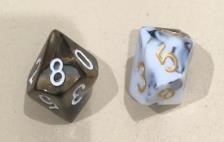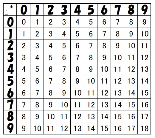 - ① 黒と白の10面ダイス(0~9)を2つ振って,出た2つの数を(黒+白)として,加法の式に表す。