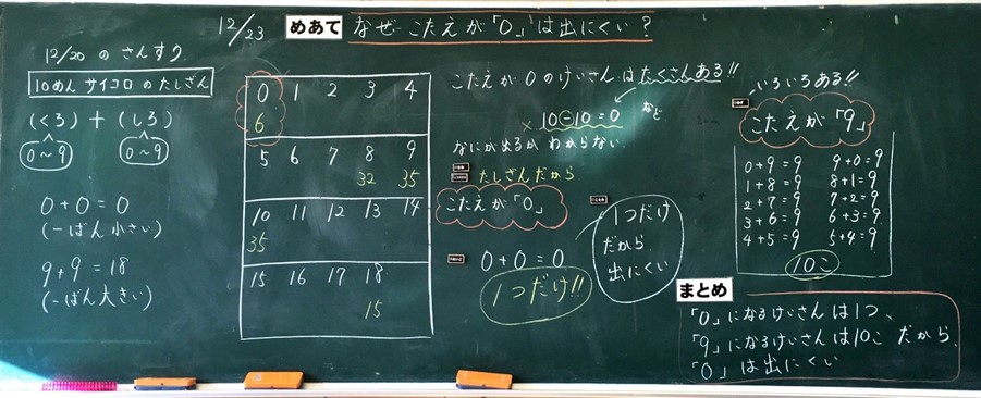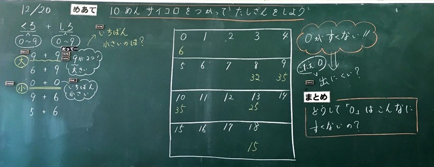 - △ 板書上に0~18になる式を全てカード等で示すことも可能だった。そうすることで,「『0』や『18』が出にくい」,「『9』が出やすい」ことが1年生の子どもたちでも視覚的に捉えることができ,確率的な思考をさらに深めた可能性がある。