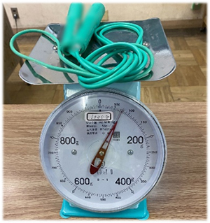 その後,1000g(1kg)まで測ることができるはかりを3・4人のグループごとに渡し,はかりの仕組み(めもりや測ることができる限界等)や使うときの注意点(平らな場所におくことやめもりは正面から読むこと等)を児童と確認した。そして,様々なものの重さを測る数学的活動をグループで行わせた。その際,交代しながら測るというルールを設けた。