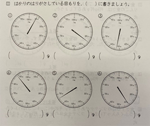 約15分ほど数学的活動を行わせた後,ミニテスト(プリント)を配付した。ミニテストは,はかりの針が指しているめもりを読む問題(6問)であった。児童は今まさに経験してきた活動がミニテストになっていることで,大変意欲的かつ自信をもってミニテストに取り組むことができていた。ミニテストの後,全員で正答を確認しつつ,自己採点させた。すると,児童の中から「やったー。全問正解や。」「今日の勉強,簡単やったわ。」とうれしそうな声があった。回収したミニテストの結果を見ると,1人だけ1問不正解であった。その児童は,③の問題の530gという正答に対し,慌てたのか30gと回答していた。見直しをしていれば,間違いに気付き,正答していたはずである。