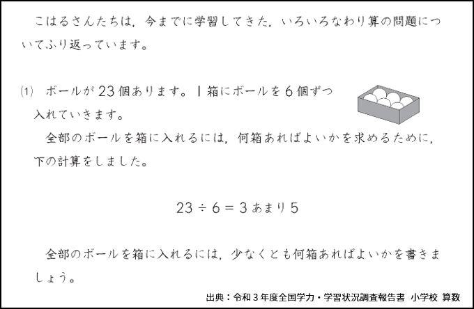 令和3年度全国学力・学習状況調査では,問題場面の数量の関係について着目し,除法が用いられる場面を理解したり,除法の結果の意味を解釈したりすることができるかを見る問題が出題された。(4「除法と小数を用いた倍」)(1)は,示された除法の結果について,日常生活の場面に即して判断することができるかどうかを見る問題で,正答率は83.1%であった。主な誤答は,「3」と解答するもので,6.6%である。出題は,イラストがあって問題場面が想像しやすくなっている。