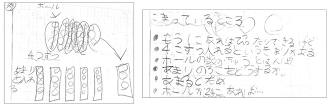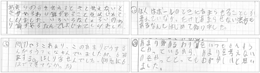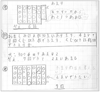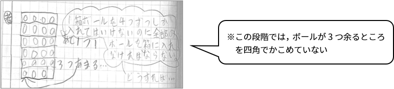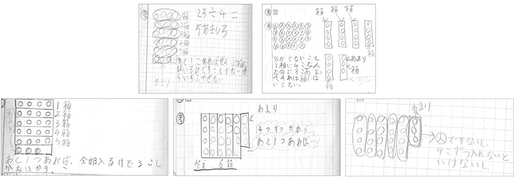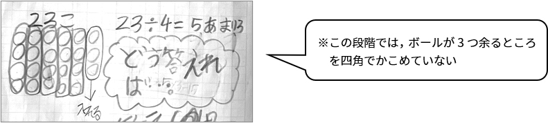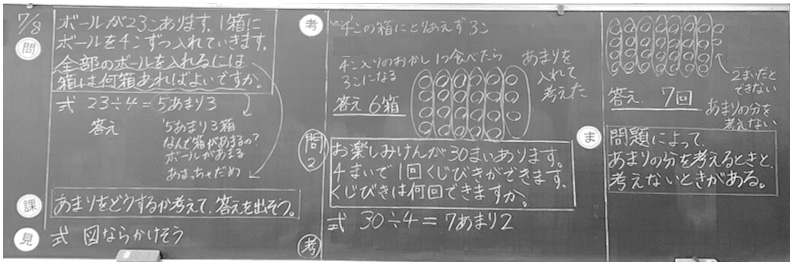 今回は,図と式を関連づけることを指導してきた。児童が図をかくことはできたが,図と式や図と計算結果を関連させるところまでは達していなかった。「5あまり3」の「5」とは「箱が5箱」という意味で,「3」はボールが「3個」というところも丁寧におさえる必要がある。今後は他学年・他単元でも,形式的に出した計算結果を振り返り,日常生活のできごとと結び付けて処理することができる力を育成する算数指導をしていきたい。