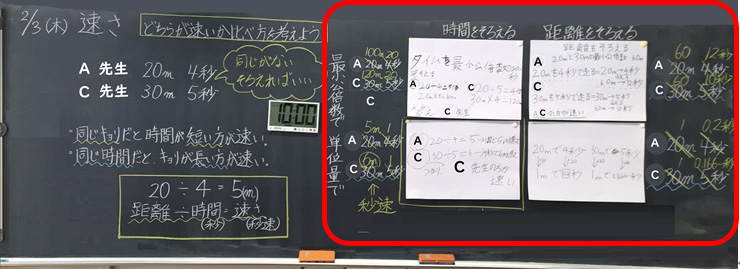 さらに,A先生とC先生は,「時間」「道のり」どちらもそろっていないから,このままでは比べられないことに気付かせておきます。