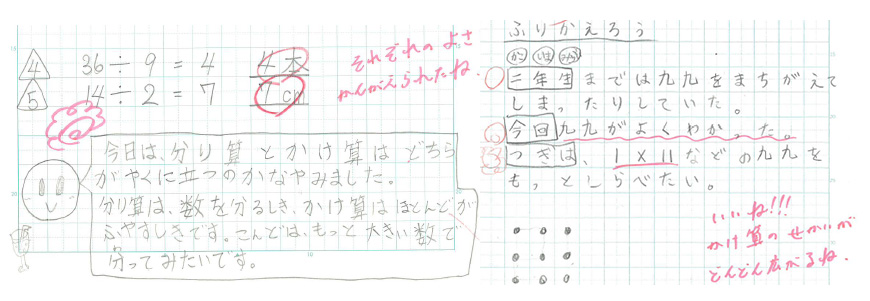 また,感情に目を向けることをきっかけとした自己省察をさせるために,今日の学習に対する気持ちを表情の絵で表現させている。これらを合わせ,本学級では,「にこちゃんコメント」という愛称で,活動に取り組ませている。図1は,3年生「九九の表とかけ算」における児童の記述の様子である。