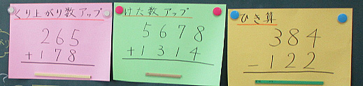 ・筆算の課題を選択し,取り組む。 A:3位数の加法で,一の位以外にも繰り上がりのある筆算 B:4位数の加法で繰り上がりのない筆算 C:3位数の減法で繰り下がりのない筆算 |
