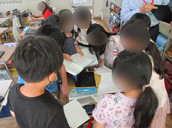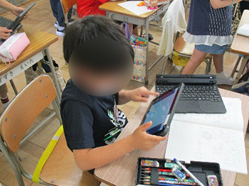 その後,自分のノートをタブレットのカメラ機能で撮影させ,提出させることで児童の進捗状況を確認した。写真が送られてこない児童を確認し,支援が必要な児童には助言したり,友達の考えを聞きに行き参考にしたりするように声掛けをした。