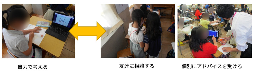 最初の5分は,自力で考えるように伝えた。本時は,計算の仕方を説明することをめあてに設定しているため,安心して活動に取り組めるように,解答は,3分ほどで,ロイロノート・スクールに送り,各自で確認するように伝えた。また,追加の問題も送ることで,違う数値でも,自分の考え方が正しいことを確認させた。5分後に,同じ課題を選んだ児童に,相談していってよいことを伝えた。