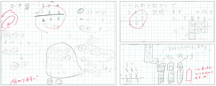 その結果,多くの児童が計算の仕方について,ノートに記述することができた。図8は,本活動における児童の記述例である。一方で,自力でノートに記述することができない児童も見られた。