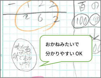 そして,「2年生のころの筆算と共通点はあるか」と投げ掛けると,「たし算」「何がいくつかを数えればよい」と言う意見が出たため,両方の意見を称賛した上で,「位ごとにいくつ分かを考える」という共通点は,「一目では分からない考え方の共通点だね」と価値付け,本時のまとめとした。