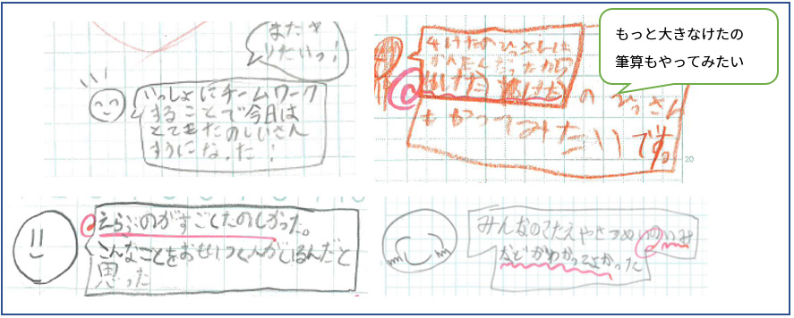 【②学習状況を把握し見通しがもてる振り返り活動の工夫】 〇本時の学習に対する気持ちをノートに記述させる。(にこちゃん:笑顔・困った) 〇本時の学習内容を通して,分かったことや次に学習したいことをノートに記述させる。(コメント:吹き出しに文章表記) |