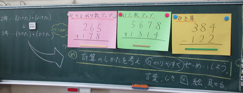 その後,3年生では,どのような筆算をするのかを予想させると,「大きい数になるのではないか」「かけ算をやると思う」「わり算もあるのかな」など学びの広がりを楽しそうに予想する姿が多く見られた。