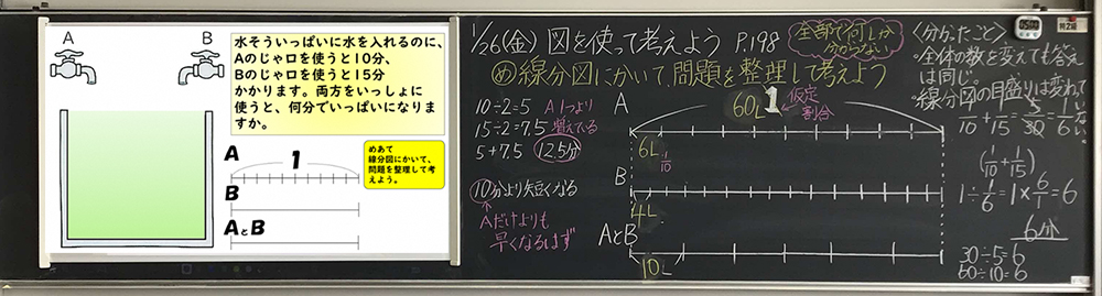 理解に苦しんでいる様子だったので,もう一つ類題を出しました。全体を60Lにしたらどうかを考えさせ,同じく6分になることを確認しました。