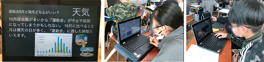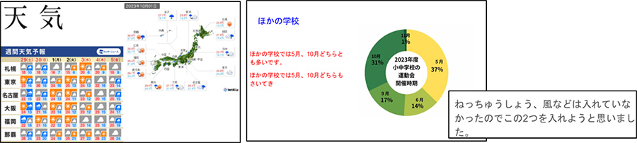 ここでChromebookを使い,調べたことをスライドにまとめさせる。「降水量」や「平均気温」など の天候に関わることだけでなく,「全国の小学校の開催時期」を調べ,結論付けをしていた。そこで,結論についての妥当性を持たせるため,次の発問をした。