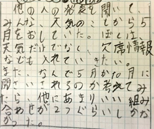 結論付けの場面から,児童自らが必要な資料を使って運動会の開催時期について結果を出していたり,結果をもとに,新たに自分の考え以外の観点について再び考察しようとしたりする児童の意見があった。「C26 11月下旬は,日照時間は長いけど平均気温が9度で低いからやめた方がいい。」や「C30 ぼくは,みんなの考えを聞いて,7月上旬に変えようと思いました。」の意見から考察を捉え直すことにつながったと考えられる。