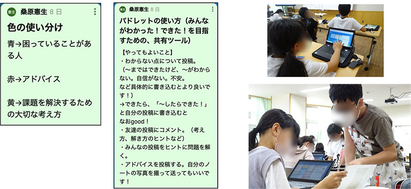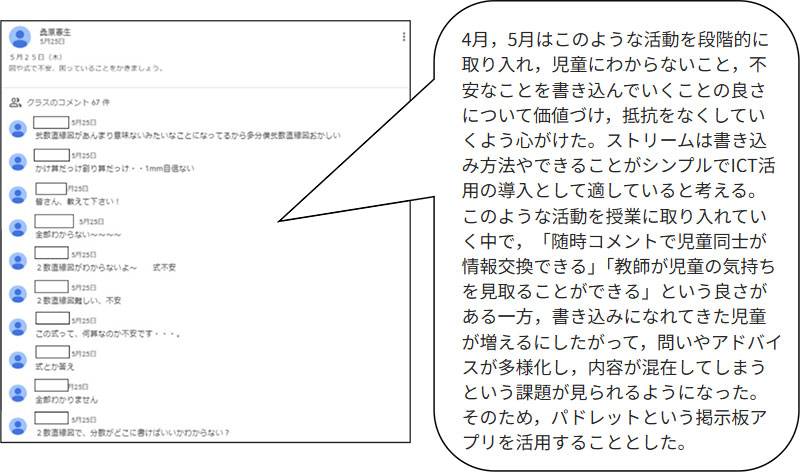 教師側はB児が抱いたような問いをつい軽視して進めてしまうところを,パドレットを用いることで問いとして共有することができた。そしてB児の問いに対し,C児が反応し,A児の同意や,D児の補足によってB児のわからなさが教師の介入なく解決されていた。