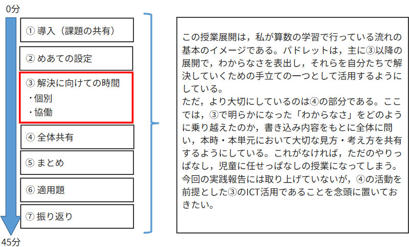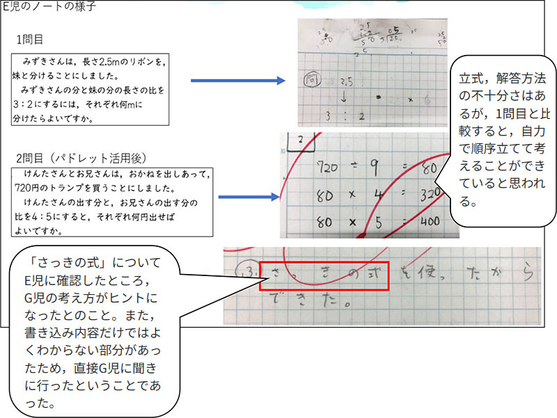 実践②より,ICTツールを活用することで,必要な時に必要な情報を共有することができる。また,解決に向けての必要な情報(立式についてや,大切な考え方等)が記録として残るので,いつでも紹介したり,参照したりすることができる。