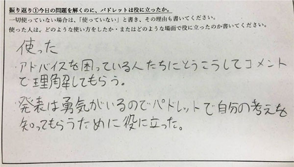 なお,突然このようなアドバイスを行った理由をA児に問うたところ,「近くの席でこの2という数は何なのかといった発言が聞こえたから。」とのことであった。A児は授業後,パドレット活用についての振り返りで次のように記述している。