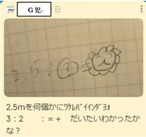 この問題を提示すると,A児から左記のようなアドバイスの書き込みが見られ,それに対してB児からは問いの書き込みが見られた。問題の出てくる順序で比は表されるという確認をしないまま授業を展開していく中でB児は比の数値が何を示すかという「わからなさ」をパドレットを通じて表現した。