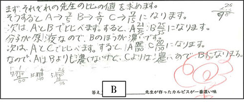 【説明にチャレンジ!】3人の先生たちが原液と水でジュースを作りました。どのジュースが濃い味なのだろうか?説明しましょう。
