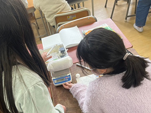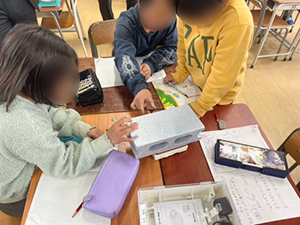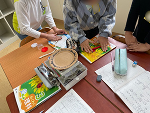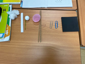 実験を始める前に,教科書の巻末の道具の使い方で電子てんびんの使い方を確認した。より重いものを量るために算数で子どもが使った台ばかりを用意し,子どもが使う道具を選べるようにした。また,教師が用意した道具は各グループに配るのではなく,まとめて置いておくようにした。こうすることで,子どもが何を量るのかを選べるようにした。