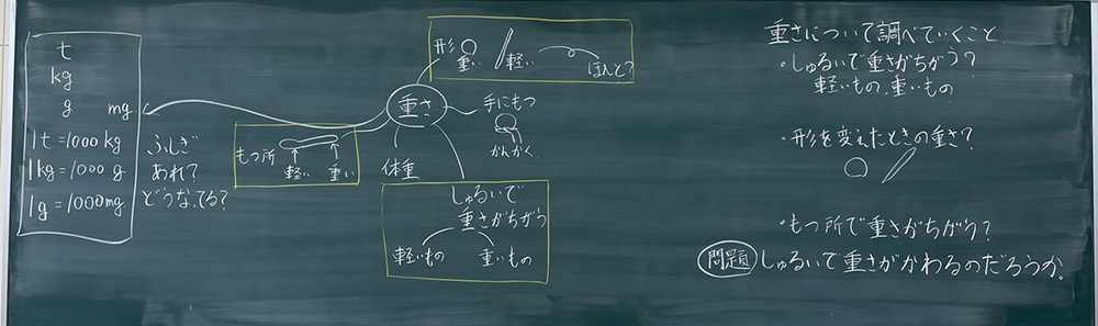 この時,子どもたちには「ふしぎ?」「あれっ?」「どうなってる?」と思ったことをノートに書いておくように伝えた。活動の中で感じたことをその場で書き出すことで,後から感じたことを振り返りやすくなり,「重さ」への問いを生み,学びの計画作りにも活かされる。子どもは,この活動でいろいろな重さを感じる経験をし,「重さ」についてイメージができ,「丸い形は重く,細長い形は軽いと形によって重さに違いがあるのでは?」と考えたり,「ものの種類によって軽いものや重いものがあり,重さが違うのでは?」と考えたり,「スプーンの持つ所によって軽かったり重かったりするのでは?」と考えたりしたことが共有された。学びの計画作りでは,子どもの不思議に思ったことから学びの計画を作るために,「重さについて調べていくことはどうしますか。」と子どもに問うた。すると,「しゅるいで重さがちがう?」「形を変えたときの重さ?」「もつ所で重さがちがう?」の3つについて調べたいと子どもたちから出てきた。そこで,「どの順で調べていくと重さについてわかりそう?」と問い,学びの計画として,種類,形,持つ所の順で調べていくことになった。そして,1つ目の問題文を何にするか子どもに問いかけ,「しゅるいで重さがかわるのだろうか。」となった。