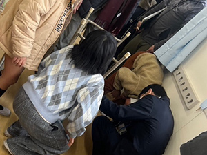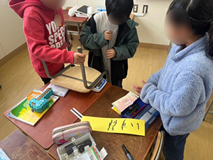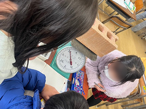 実験では,いろいろなものを取って来ては重さを量る姿が見られた。思っているよりも重かったり,軽かったりすることに驚いたり,重さを黒板のカードに書きに来たり,重そうなものは台ばかりを持って来て量ったりしていた。中には,教室にある時計を参観している教員に頼み取ってもらい量る姿や,机やいすの重さを量るために量り方を相談する姿が見られた。本校の台ばかりは4kgまでしか量ることができず,机の重さはそれよりも重かった。そこで,台ばかりを2台並べて机をのせて重さを量り,2台の台ばかりの示した重さを足し合わせることで,机の重さを量った。