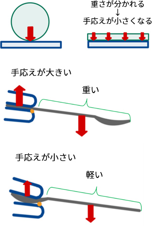 さて,スプーンの持つ位置と重さについて,子どもは体験活動の中でスプーンの先を持った時と柄を持った時とでは重さが違うように感じ,不思議に思ったようである。これは,ものの形を変えた時に,重さが変わったように感じるのと同じである。手で感じる手応え(圧力)と重さには違いができるためである。形を変えた時は,丸い形にすると手に触れる面積は小さくなり,圧力は大きくなる。一方,平べったい形にすると手に触れる面積は大きくなり,圧力は小さくなる。そのため,手応えが変わるのである。では,スプーンの持つ位置による手応えの変化であるが,これは「てこのはたらき」が関係している。縦に持つとあまり重さの違いは感じないが,横向きに持つと重さを感じるのは,持っていない部分の重さを支えるためである。
