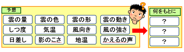 気づく段階では「天気にはきまりがあり,それは雲の様子が関係しているのではないか」という学習課題を設定します。そのために,ゲリラ豪雨を紹介し,局所の天気だと自分たちでも予測できるのではないかと想像させました。子どもたちは,ゲリラ豪雨は気象予報しでさえ予想するのは難しいが,自分たちの住んでいる局所であれば,天気を予測するこ子ども達が考え出した天気を予測する上での条件は,雲の様子以外に,気温や風向き,風の強さなど,面白いのはかえるの声というのもでました。