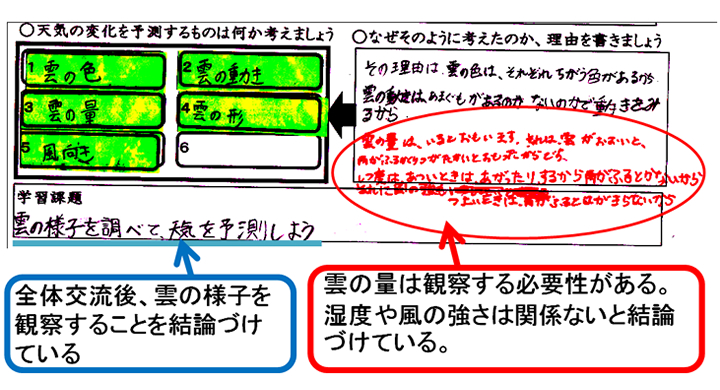 カードを操作する中で雲の色,雲の動き,雲の量,雲の形,風向きに絞り込むことができました。グループ交流後に再考する表現活動では,「雲の量はいると思います。それは雲が多いと雨が降ると考えたからです。湿度が高かったり,風が強いからといって雨が降るとは限らないから」と表記しており,雲の量が必要であることや湿度や風の強さは条件として外していることが分かります。その後,全体交流では,風向きはどんどん時間によって変わり,そのことによって天気が変わることが少ないことから,表現・交流活動の結果,天気のきまりを予測するには雲の動きを観察する必要があることがわかり,学習課題を設定することができました。