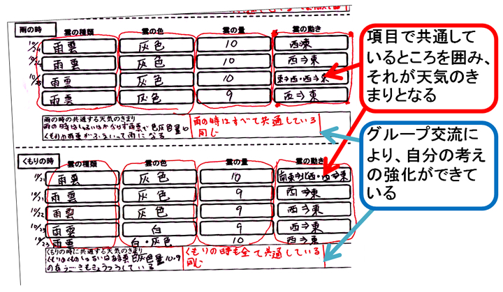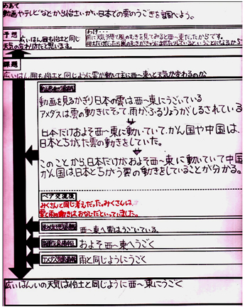 まず,局所の天気を直接観察させました。そして,晴れのとき,雨のとき,曇りのときと分けて,ノートに整理をさせました。ノートには,晴れ,くもり,雨の時の共通する事柄を赤で囲み,帰納的に天気のきまりを導き出すようにしました。児童は,雲の動きが西から東,南西から北東を共通していると判断しています。また,雲の色が黒っぽいこと,雲の種類も共通していると判断しています。児童が帰納的に導き出したきまりはまだ,客観性が得られていないので,ペア交流を行わせ,考えを付加させました。児童は雨の時も,くもりの時も共通している。同じと付け加えています。つまり,友達との交流により考えが強化されたことになります。このようなノートによる思考と交流により,局所の天気は雲の動きに伴っておよそ西から東へと変わることを明らかにすることができました。