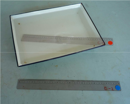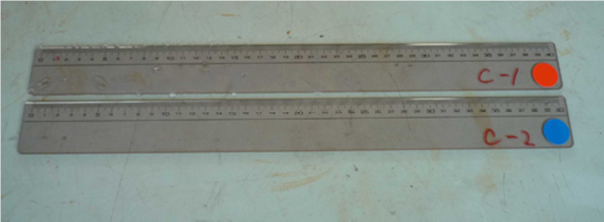 お湯に入れた定規(赤)入れていない定規(青)