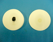(5) 3~5分後,漂白した液を2枚重ねたろ紙に数滴たらす。(下のろ紙にろ過した液を吸収させる) |