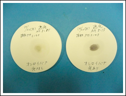 (7) クワ(前々日の夕方遮光,前日は快晴。当日の朝6時20分に葉を採取。午後1時30分に実験。左 光なし 右 光あり)