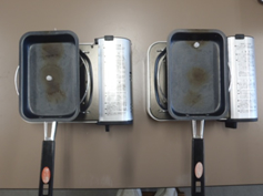 同じ2つのフライパンの異なる位置にろうを置き,熱する部分を同じにして比較させる事象提示である。ろうのとけ方の違いを観察させ,その要因を考えさせることで問題づくりをさせた。(実際は,アルコールランプで実施)