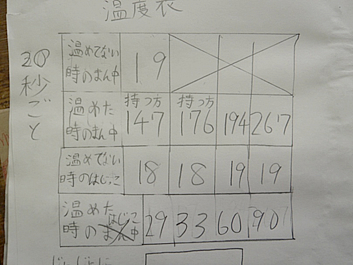 実際に測定してみると,温度の上昇が速いために,正確な数値を読み取ることが難しかったようである。しかし,温度の変化の様子を捉えることはでき,熱した部分から順にあたたまっていくという予想とずれる結果ではなかった。