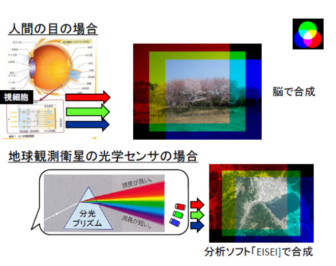 これらの効果を高めるためには,可能であるなら年齢に応じた工作活動等をとおして人工衛星の観測手法の基礎である光の概念をある程度知っておくことによって,衛星データ活用の教育効果が高まるであろう。(前回紹介した「簡易分光器」「色合成器」などは学習指導要領との関わりを深く考慮する必要があるが,導入時の指導者説明(演示)の一環に加えるなど総合的な学習の時間での題材に工夫するなどの活用も考えられる)