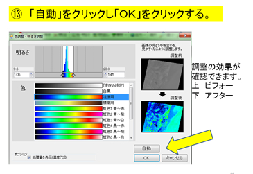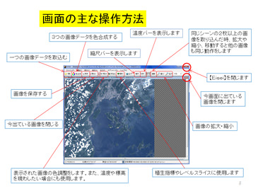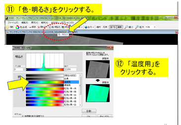 紙面の都合でフォルスカラー・トゥルーカラー・ナチュラルカラー・輝度温度のみ具体的な操作を補足的に説明した。「EISEI」では,植生指数とレベルスライスという機能も既に持っている。