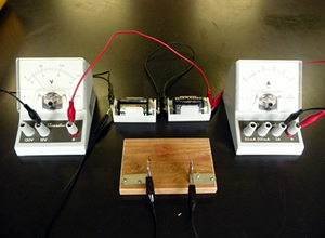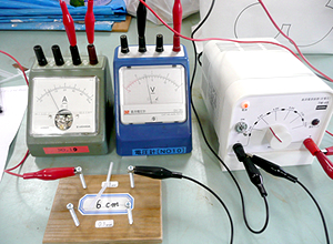 本校では,電源装置に連続可変ボリューム式(シマズES-5N S.55年購入,写真1)を使っているが,この実験では電熱線にかかる電圧や流れる電流が大きく影響するので,他校の電源装置,乾電池(新しいもの,多少消耗しているもの),充電池(エネループ)を使っての実験も試みた。